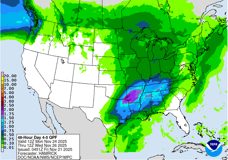 Первые пару дней в праздничной неделе будут включать ливень в юго-центральной части США, согласно Национальной метеорологической службе, широко распространенные умеренные и сильные дожди, в основном в виде повторяющихся раундов гроз, вероятно, от северо-восточного Техаса до большей области метро Мемфиса в понедельник, 24 ноября.