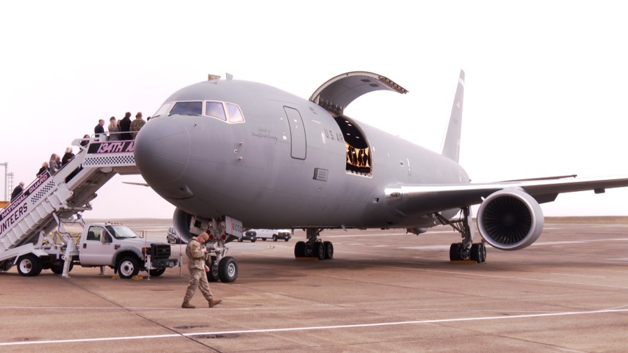 Один из новых самолетов-заправщиков KC-46A Pegasus был представлен на авиабазе национальной гвардии Макги Тайсон в воскресенье.