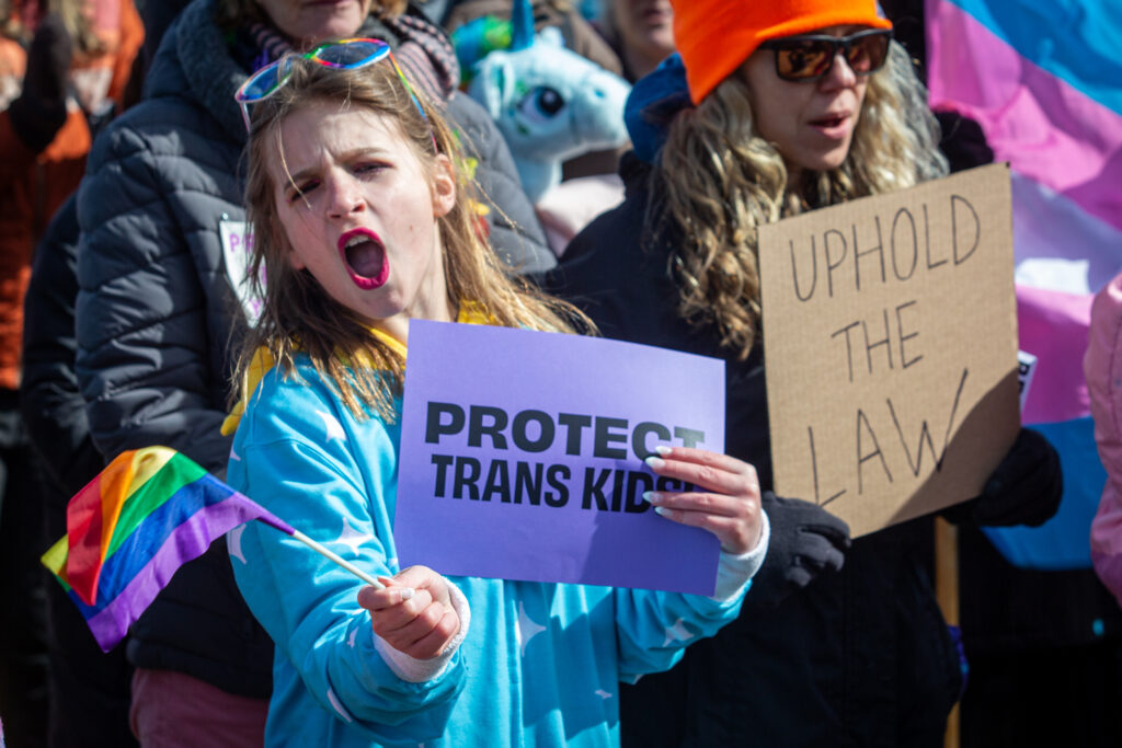 Сторонники кричат и машут знаками на митинге в Камберленде, штат Мэн, в воскресенье, 23 марта 2025 года, призывая законодателей штата Мэн и местных школьных чиновников MSAD51 поддержать спортсменов-трансгендеров.