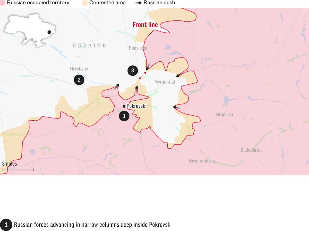 Российские войска также обеспечили два узких коридора в центр города с юга и вверх по его западной стороне, согласно карте, которая показывает остальную часть Покровска в основном в спорной серой зоне.