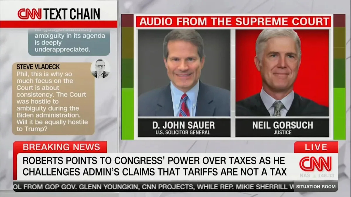 Судья Верховного суда Нил Горсух, который был выдвинут президентом Дональдом Трампом, в среду боролся с генеральным прокурором Джоном Зауэром за пределы исполнительной власти, заслушивая дело о законности радикальных тарифов Трампа.