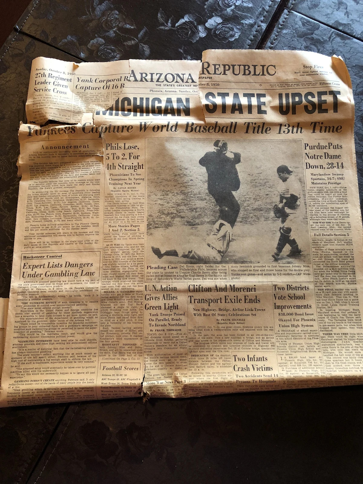 Разворачивая листья или расширения для обеденного стола, она заметила, что они были завернуты в копии «Аризонской республики», датируемые 75 годами.
