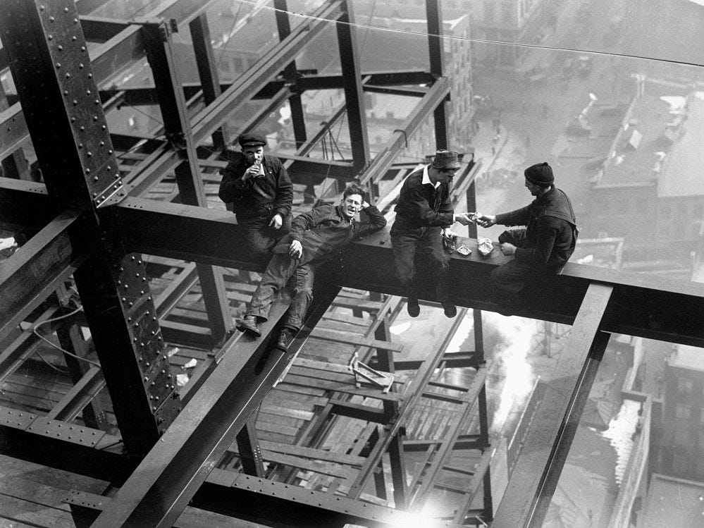 В Смитсоновском документальном фильме «Америка в цвете: 1920-е годы» показан мужчина, поднимающийся на стальной балке высоко над городом, как обезьяна.По данным документального фильма, рабочие восемь часов валялись в облаках без упряжек или перерывов в ванной.