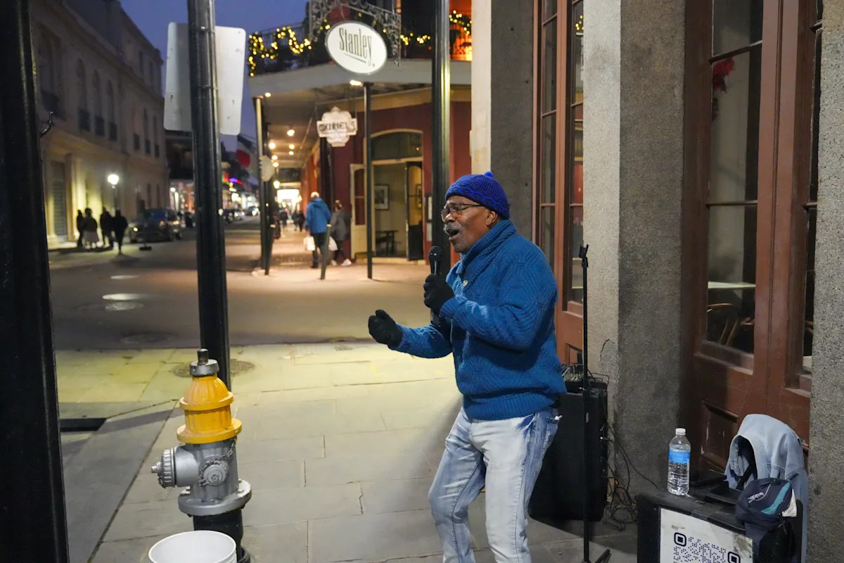 Но в более тихих районах все, ну, тише. прохладным декабрьским вечером, когда капли дождя усеяли тротуар, давний уличный исполнитель Онунзе Убака, 72 года, нагрудил классику Motown практически в пустой угол от обычно оживленной площади Джексона во французском квартале. Немногие туристы проходили мимо. Еще меньше останавливалось, чтобы бросить долларовые купюры в свое ведро с белыми кончиками.