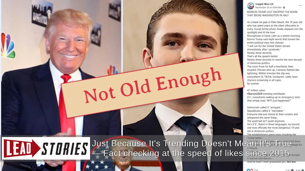 В посте в Facebook содержалась еще одна поддающаяся проверке ложная деталь. Он утверждал, что хэштег #Barron2028 стал вирусным во всем мире. Тем не менее, поиск по X для этого хэштега приводит только к четырем постам (архивировано здесь) после 19-го дня рождения Баррона (20 марта 2025 года), и ни один из них не упомянул о запуске Сената.