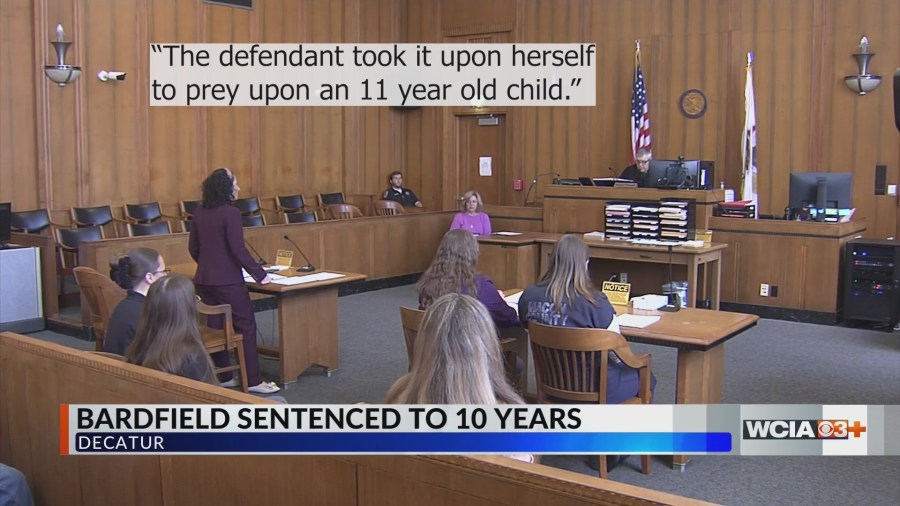 Бардфилд, ранее работавшая в государственных школах Decatur, появилась в зале суда судьи Родни Форбса в четверг, чтобы узнать свою судьбу. Она признала себя виновной в прошлом месяце в хищническом преступном сексуальном насилии над ребенком, уголовном преступлении класса X, наказуемом лишением свободы на срок до 60 лет. Переговоры между обвинением и защитой привели к тому, что прокуроры попросили 40-летний срок, но точная продолжительность была до судьи Форбса, чтобы решить.