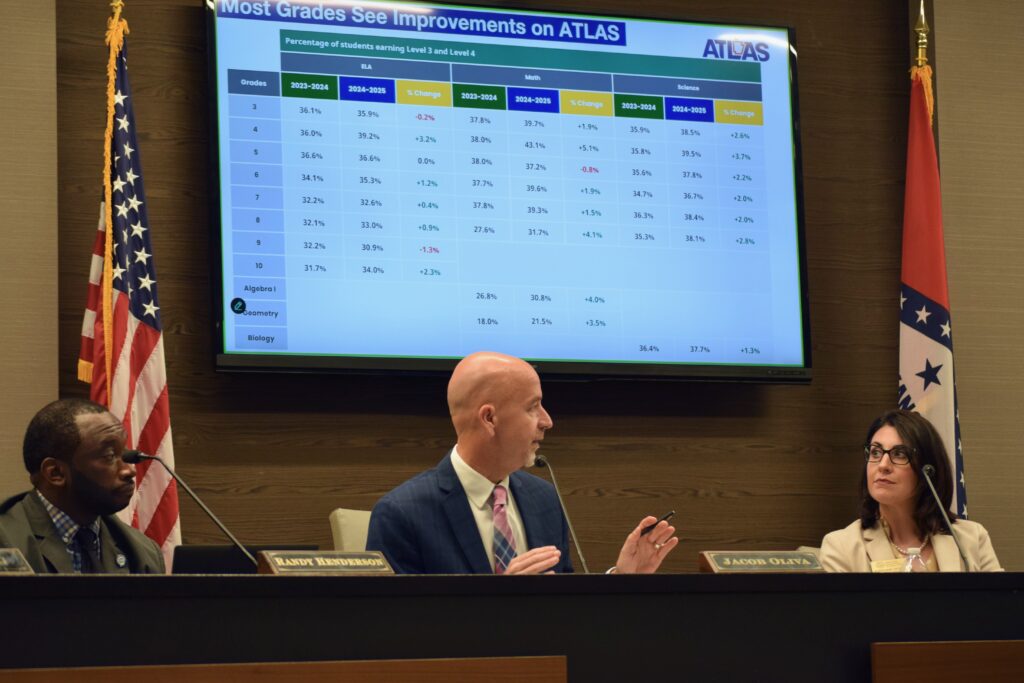 Министр образования Арканзаса Джейкоб Олива (в центре) обсуждает оценки на заседании государственного совета по образованию 10 июля 2025 года, когда слушают члены Рэнди Хендерсон и Адриен Вудс.