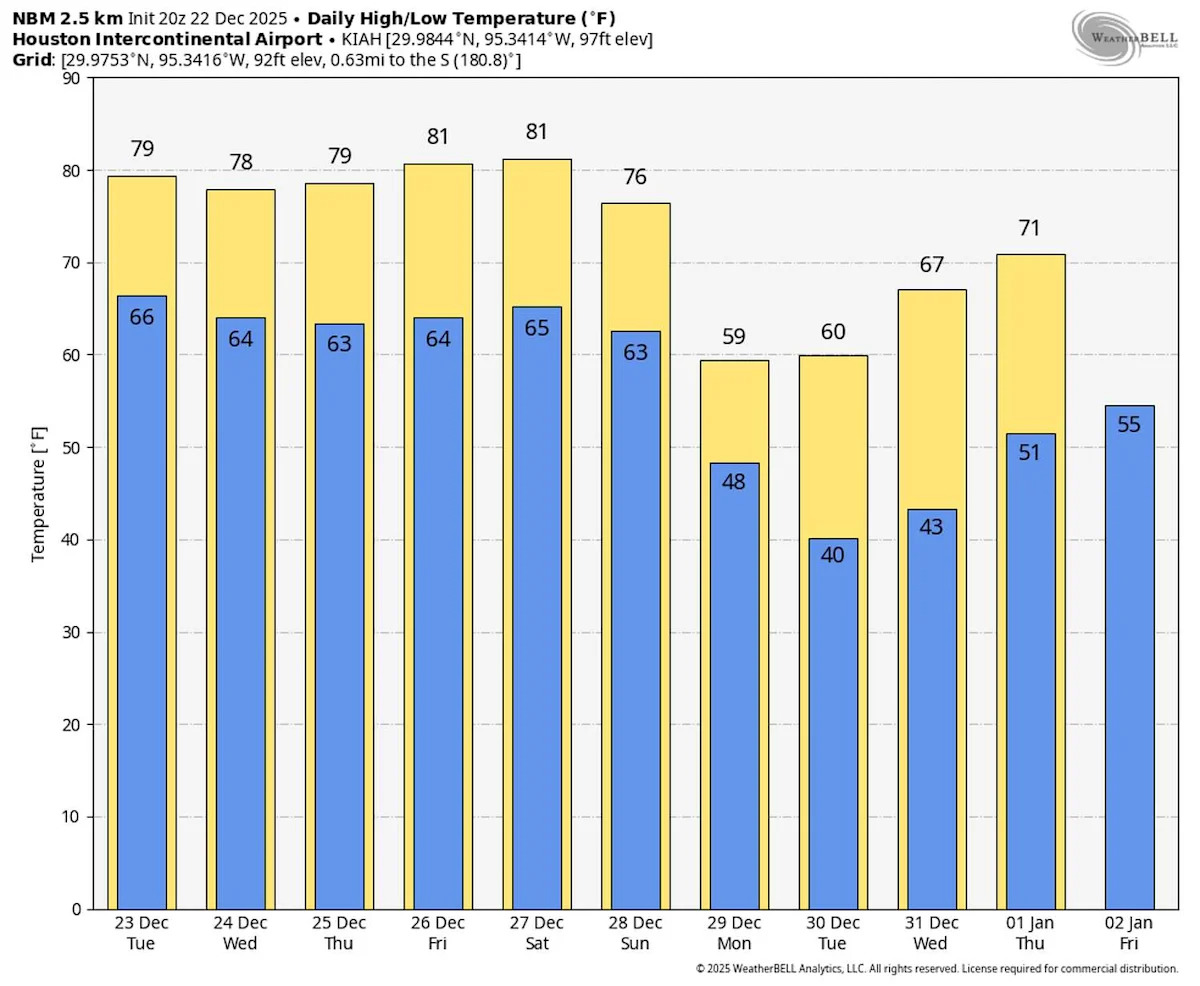 Еще дальше во времени, еще один холодный фронт может приблизиться к Хьюстону в течение первой недели января. Это далеко, очевидно, невозможно сказать с уверенностью, насколько холодно это может получить. На данный момент, любой, кто планирует вернуться в Хьюстон после Нового года, должен следить за ежедневными прогнозами, чтобы выяснить, какой гардероб сезона вам понадобится.