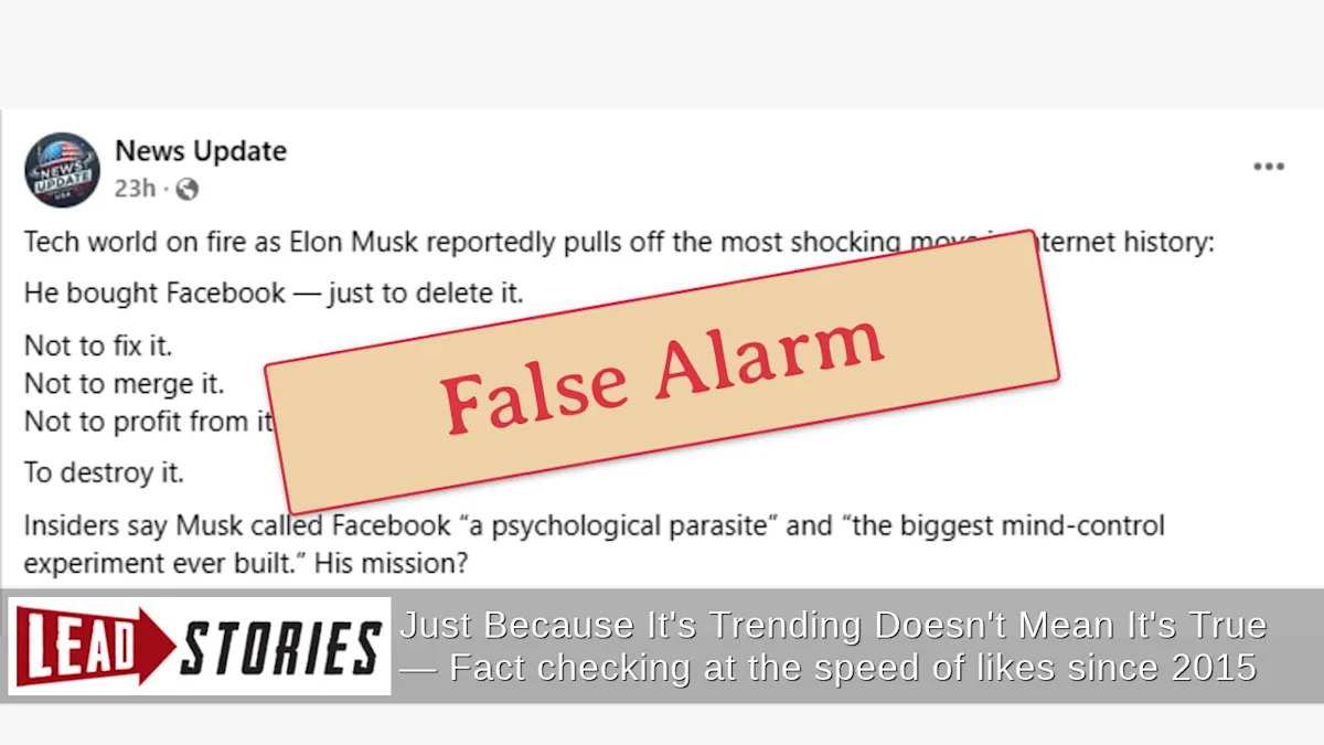 «Техномир горит» из-за новостей о том, что Илон Маск купил Facebook, чтобы «удалить его?» Нет, это неправда: Meta (владеет Facebook) не объявила и не задокументировала продажу, как это требуется от публично торгуемых компаний. Lead Stories не нашла достоверных новостей о предстоящей продаже Маску. Сайт, который породил слухи, является одним из операторов «Вьетспама», Lead Stories разоблачил в 2025 году за привлечение веб-трафика, распространяя скандальные и шокирующие слухи о выдающихся американцах в фейковых новостях.