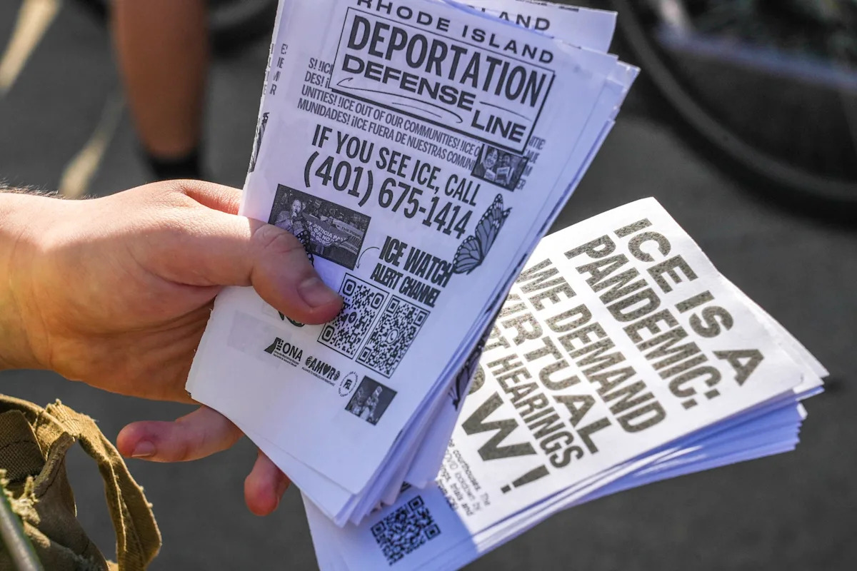 В течение последнего месяца добровольцы патрулировали улицы возле зданий суда Род-Айленда в Провиденсе каждый будний день в поисках агентов ICE. Они распространяют информацию о линии обороны депортации по номеру 401-675-1414, чтобы сообщить о наблюдениях ICE, а также о присутствии сотрудников иммиграционной службы поблизости.
