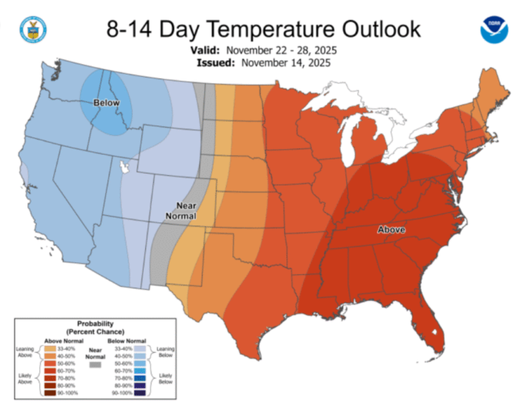 Прогноз NOAA показывает, что в конце ноября по декабрь большая часть юго-востока, скорее всего, увидит более высокие температуры, в то время как части северных Соединенных Штатов и запада наклоняются холоднее. В течение полной зимы с декабря по февраль NOAA прогнозирует более высокие средние температуры для большей части юга, наряду с осадками ниже среднего, что вызывает обеспокоенность засухой.