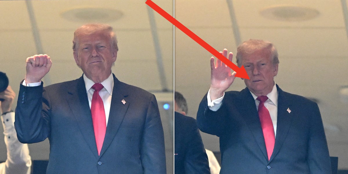 Трамп поднимает руки вверх, чтобы взмахнуть, что для него обычно, но это «более нерешительная» волна, сказал Вуд. Примерно через четыре секунды после видео он поднимает руку прямо, жестко, «что является движением, направленным в сторону», сказал Вуд.
