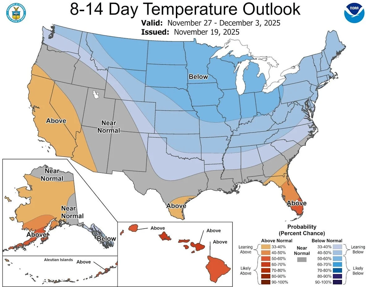 К Дню благодарения ожидается, что текущая температура выше, чем нормальная, в США снизится из-за одного из самых ранних значительных сбоев полярного вихря, сообщает CNN.