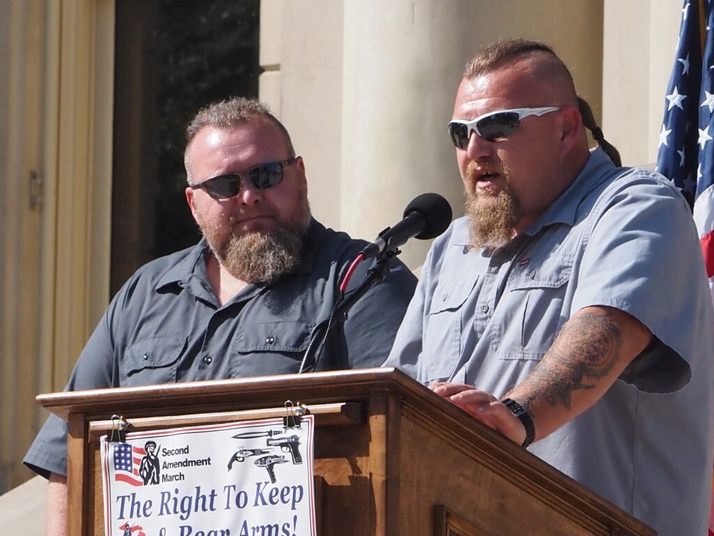Уильям Нулл (справа) и его брат-близнец Майкл Нулл (слева), которые были оправданы по обвинениям, связанным с заговором 2020 года по похищению губернатора Мичигана Гретхен Уитмер, выступают на мероприятии Второй поправки Марта за пределами здания Капитолия Мичигана 19 сентября 2024 года.
