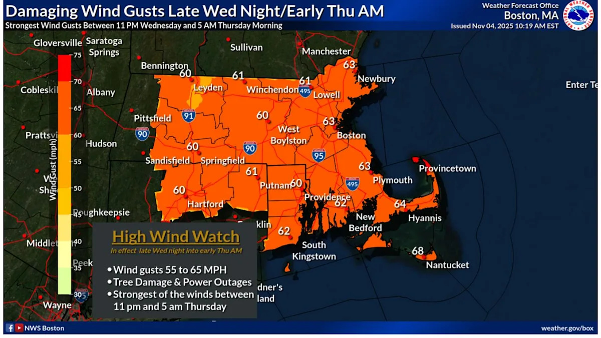 Национальная метеорологическая служба выпустила рекомендации по ветру, действующие до 7 часов вечера 4 ноября для северо-западных ветров от 10 до 20 миль в час, с порывами до 45 миль в час в частях восточного, западного, центрального, юго-восточного и северо-восточного Массачусетса, южного и северного Род-Айленда и северного Коннектикута.