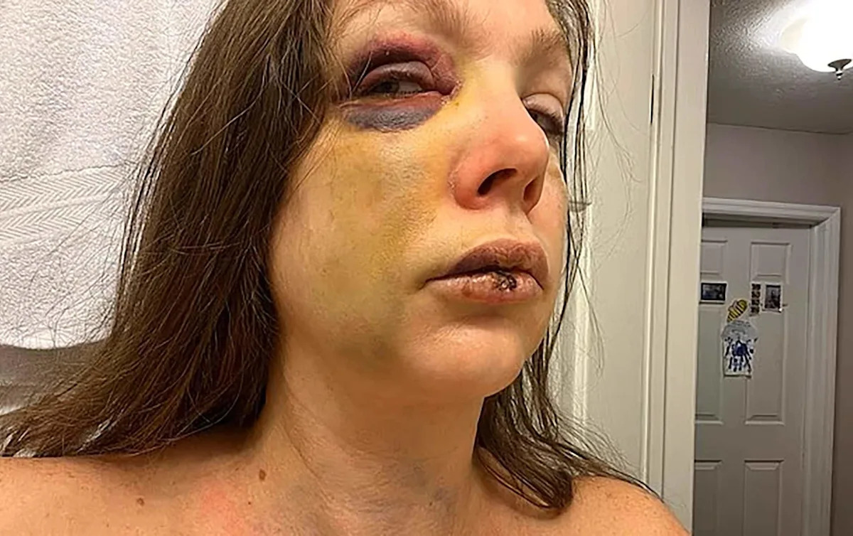 Фотографии последствий показывают Холли, мать-одиночка, согласно сообщениям, с глубокими фиолетовыми синяками вокруг ее опухшего правого глаза и раздвоенной губы.