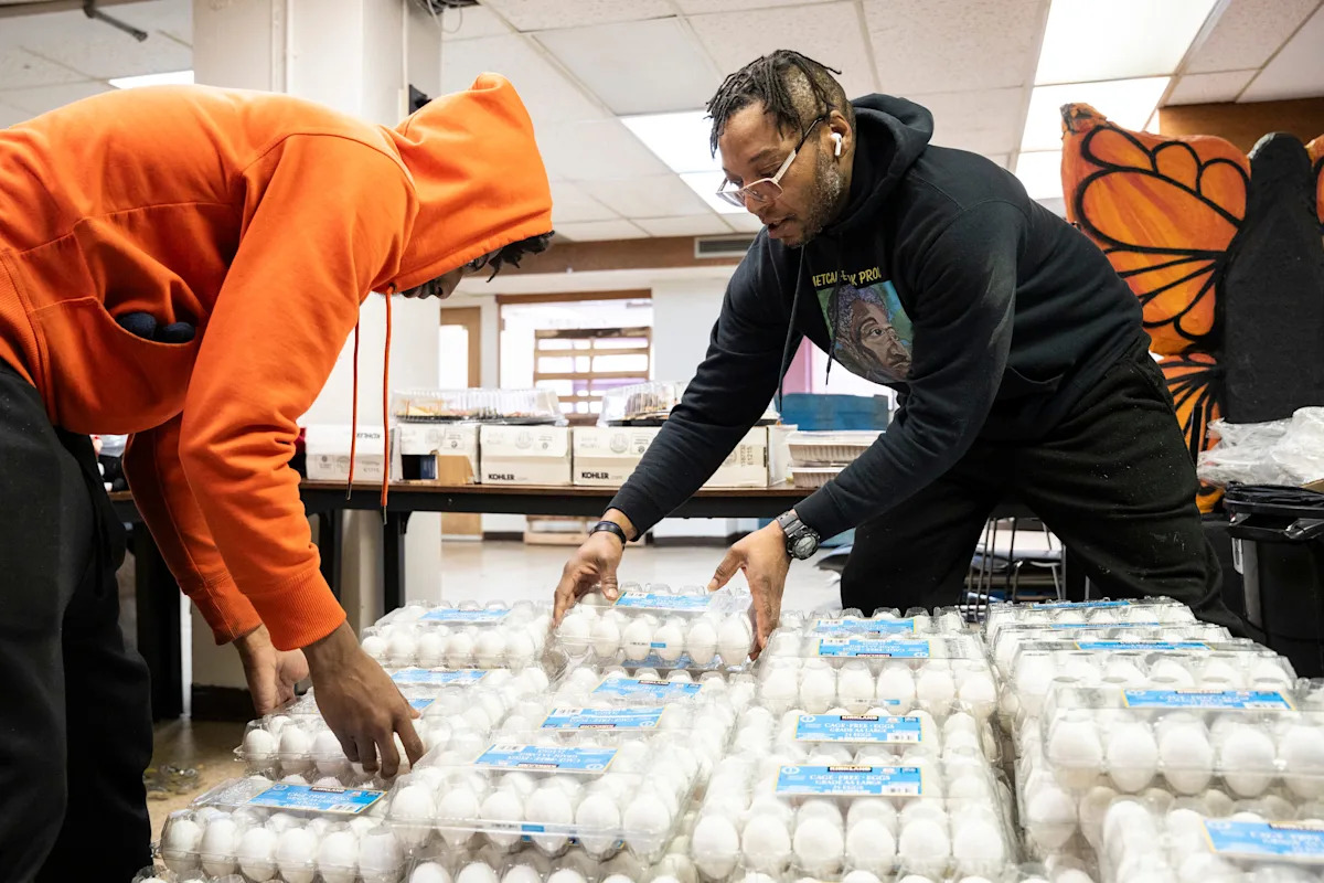 Столы, полки и холодильники были забиты яйцами, молоком, продуктами и консервами. Также были доступны наземная индейка, курица и бекон — основные продукты, которые, по словам жителей, все труднее себе позволить. Семьи подбирали подгузники, детскую смесь и средства гигиены размером с путешествие. Также распространялись бесплатные дозы наркана и маски для лица. В другой комнате жители просматривали пожертвованные пальто, обувь и одежду.