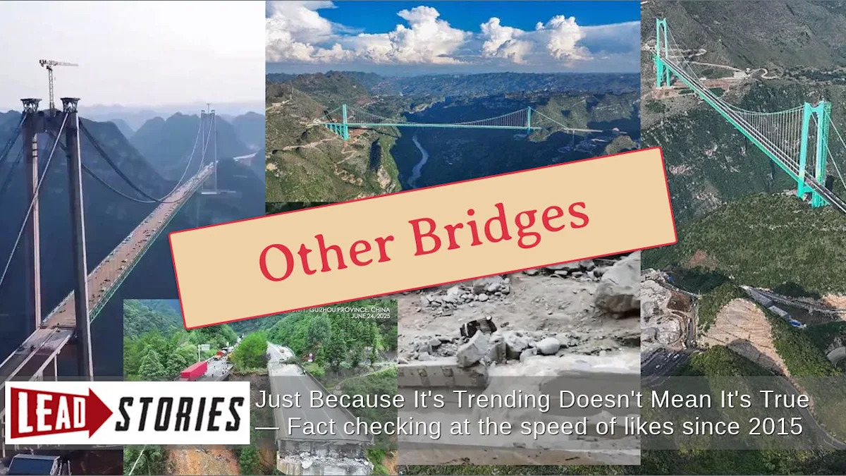 Многие вводящие в заблуждение посты в социальных сетях показывают подвесной мост, который окрашен в яркий сине-зеленый цвет. Это не мост Хунци. Синий подвесной мост — мост Хуацзян Гранд-Каньон, в провинции Гуйчжоу, Китай. Это самый высокий в мире мост, пересекающий каньон 625 метров над рекой Бейпан. Об открытии моста для движения транспорта сообщалось (архивировано здесь) 29 сентября 2025 года по nbcnews.com.