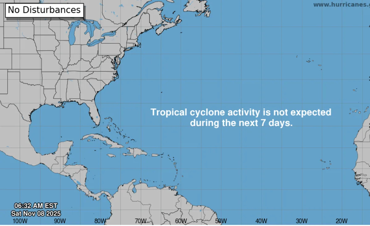 По данным субботы, 8 ноября 2025 года, метеорологического консультирования от Национального центра ураганов в Майами, штат Флорида, активность тропических циклонов не ожидалась в течение следующих 7 дней. Атлантический сезон ураганов приходится с 1 июня по 30 ноября каждого года.