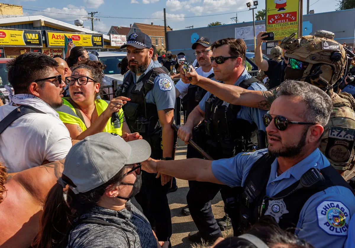 На видео с сиреной на заднем плане и вертолетом выше видно, как сотрудники полиции Чикаго пытаются очистить проспект Кедзи от транспортных средств, участвующих в аварии 4 октября, и обеспечить скорую помощь для человека, взятого под стражу иммиграционными агентами.
