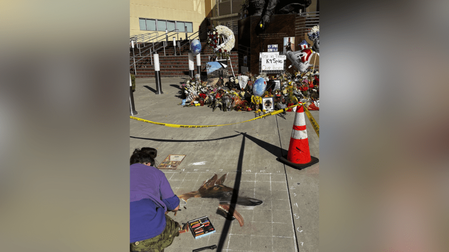*Александра Кливленд работает над меловым мемориалом полицейской собаки Спайка из Бурбанка, которая была убита при исполнении служебных обязанностей 23 ноября 2025 года.