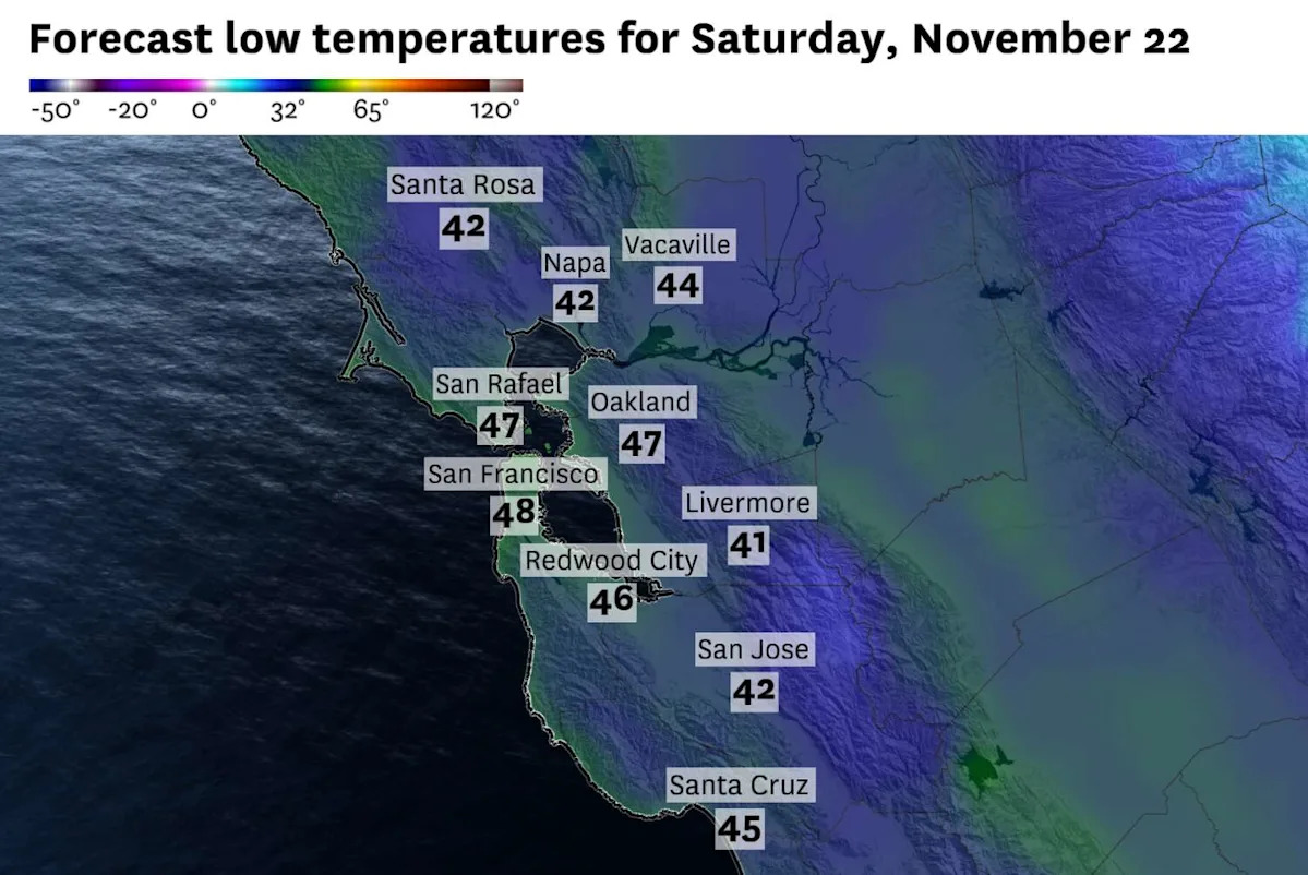 Влага, испаряющаяся с земли после дождя в четверг, поможет в формировании тумана в пятницу утром, особенно в долине Три-Валле и Санта-Клара. Ожидается, что легкие северные ветры будут дуть сухим воздухом через дельту в направлении Сан-Франциско, удерживая туман от города в большинстве случаев. Суббота и воскресенье имеют больше шансов начать туман в большей части залива, когда ветры расслабляются.