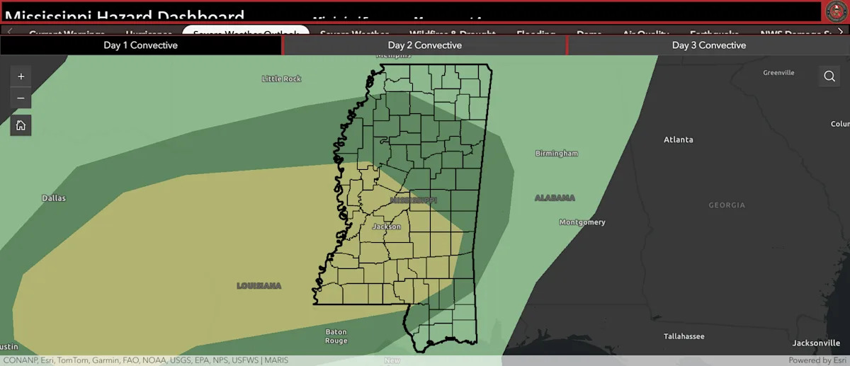 Согласно карте Агентства по чрезвычайным ситуациям Миссисипи, большая часть центральной части Миссисипи находится под небольшим риском суровой погоды.