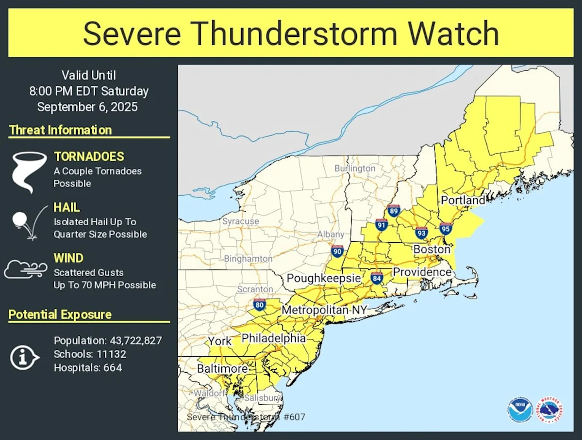 Центр прогнозирования штормов говорит, что северный Нью-Джерси и большинство центральных и юго-западных районов Нью-Джерси имеют небольшой риск попадания в результате сильных гроз в субботу, а юго-восточные и прибрежные районы штата имеют незначительный риск.