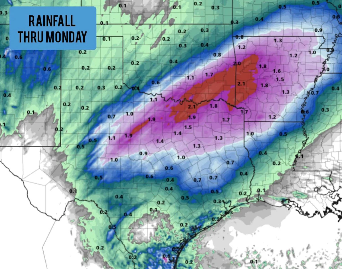 Самые сильные дожди с вечера воскресенья по понедельник пройдут через Северный Центральный Техас. Широкий участок 1-3 дюйма дождя ожидается в Абилине, DFW Metroplex, Шерман-Денсон и Тексаркана. Также возможны изолированные более высокие количества до 5 дюймов, особенно в сторону Красной реки.