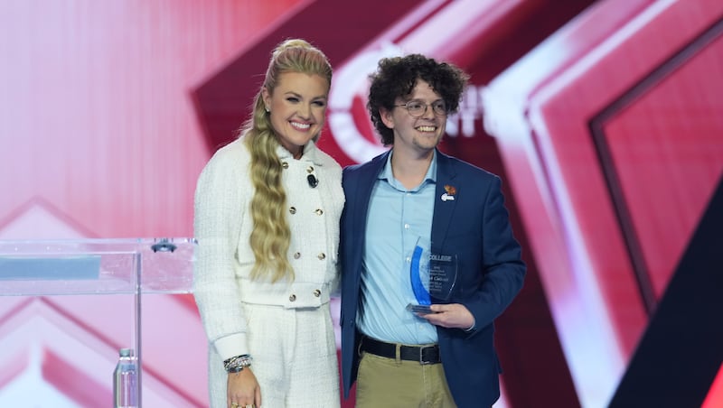 Эрика Кирк вручила награду Чарли Кирка Кураж студенту из Юты в субботу на конференции AmericaFest в США.