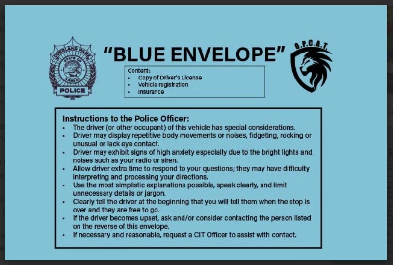 «Есть много взрослых аутистов, которые не водят машину. Так что, это отличная вещь, возможно, на дворе, — сказал Хаус. — Синий наклейка на конверте — отличная идея, которая предупреждает полицейского».