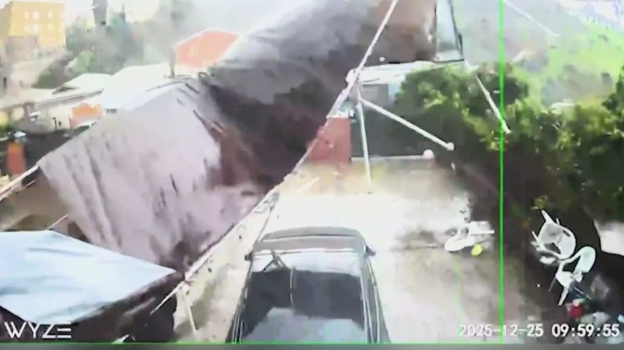 Камеры наблюдения зафиксировали торнадо EF-0, приземляющийся в районе Бойл-Хайтс, и запустили мебель и мусор в воздух 25 декабря 2025 года.