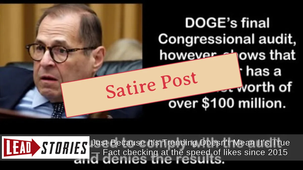 Doge обнаружил, что у конгрессмена-демократа Джерри Надлера есть скрытый собственный капитал в 100 миллионов долларов? Нет, это неправда: Распространение этого слуха Надлера и ложное утверждение о его огромном богатстве пришло со страницы в Facebook с сатирическим отказом и предупреждением о том, что все содержимое страницы сфабриковано. Владелец страницы известен тем, что обманывает консерваторов в симпатии и обмене выдуманным контентом. Сайт включает предупреждение, которое гласит: «ничто на этой странице не является реальным». Оценка богатства Надлера не основана на фактах.