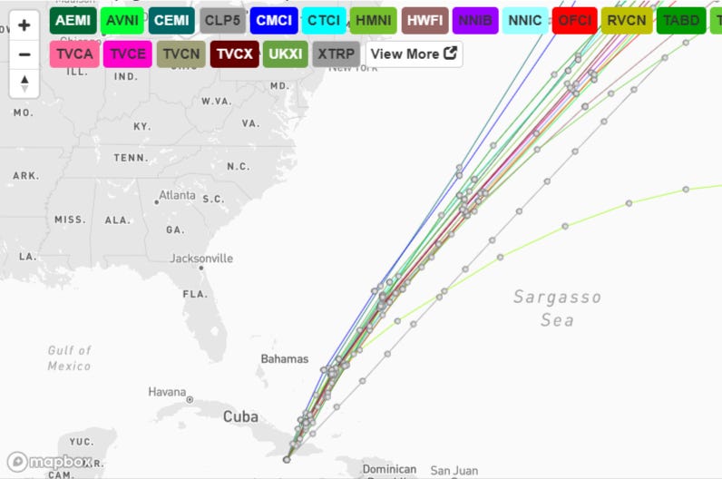 **Специальная примечание о моделях спагетти: ** Иллюстрации моделей Спагетти включают в себя множество инструментов и моделей прогнозирования, и не все они созданы равными. Центр ураганов использует только четыре или пять лучших моделей с самыми высокими показателями, чтобы помочь сделать свои прогнозы.