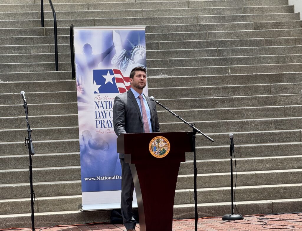 Генеральный прокурор Джеймс Утмайер выступает во время Национального дня молитвы в комплексе Капитолия Флориды 1 мая 2025 года.