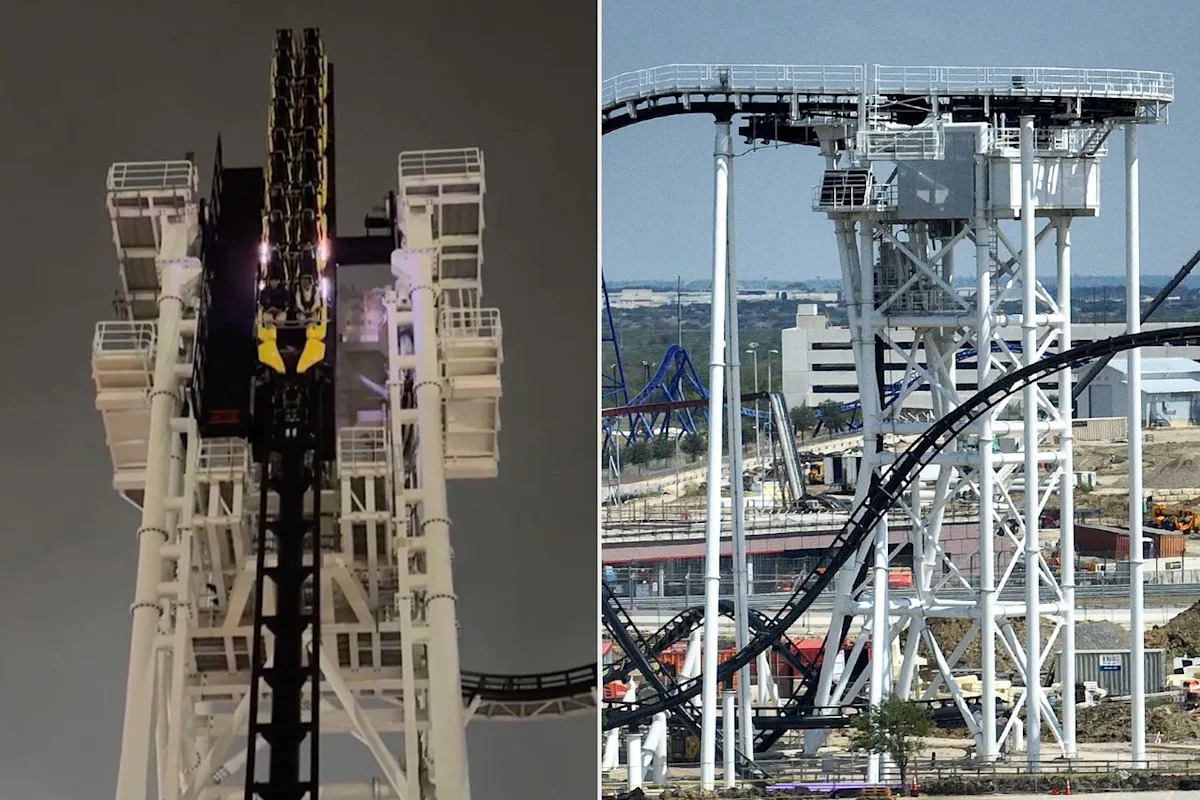 Ужасающий наклонный горок в Техасе остановился в среду вечером, в результате чего два гонщика висели на 130 футов в воздухе.