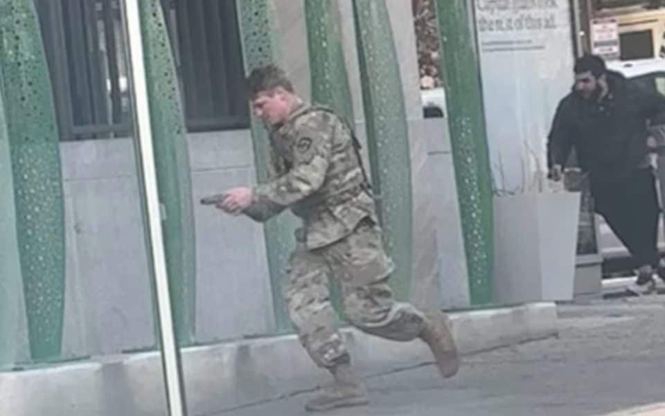 Одетый в черное пальто с револьвером в руке, появилась фотография, показывающая момент, когда афганец устроил засаду Национальной гвардии США на улицах Вашингтона.