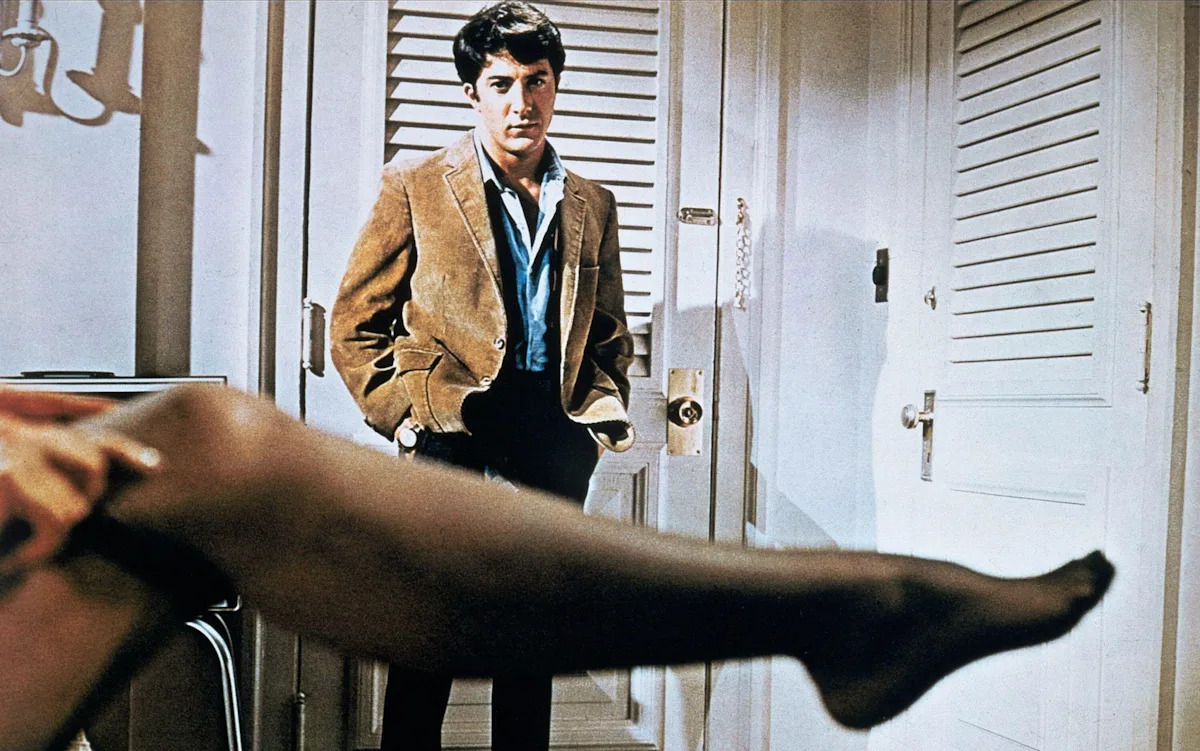 Сцена соблазнения изображает Бенджамина через нижнюю часть ноги миссис Робинсон, прежде чем пара поднимается наверх в спальню, где она появляется только в своем лифчике и отпускает кнопку рубашки Бенджамина.