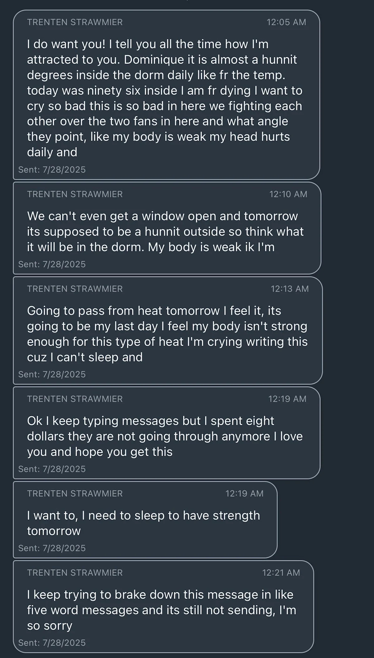 Заключенный Тайлер Бимер сказал, что чувствует себя плохо и изо всех сил пытается дышать сквозь густой горячий воздух.