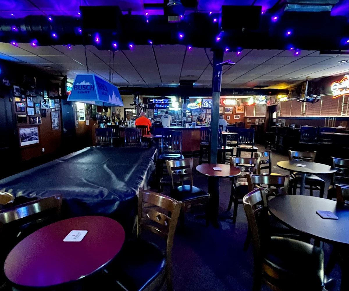 Внутри темно и дымно с большим баром, высоким верхним квадратом и низкими круглыми столами и стульями, несколькими струнами рождественских огней, бильярдным столом и сценой. Старые фотографии и неоновые вывески заполняют стены на панелях, а куча заполненной льдом ванны с пивом является фокусом.