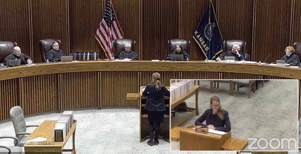 Адвокат Джад Керр дает показания в Верховном суде Канзаса о действительности просроченных платежей в размере 21 000 долларов США по делу арендодателя-арендатора. (Скриншот с экрана Канзасского рефлексора, рассмотрение дела Верховного суда Канзаса)