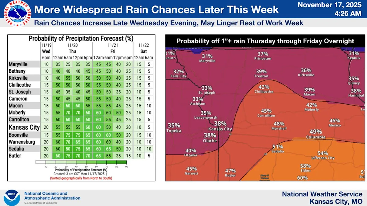 Шансы на дождь в Канзас-Сити с 20% вечером в среду до 55% и 60% в четверг. Шансы на дождь в пятницу снижаются с 60% утром до 40% днем, а затем 20% вечером.