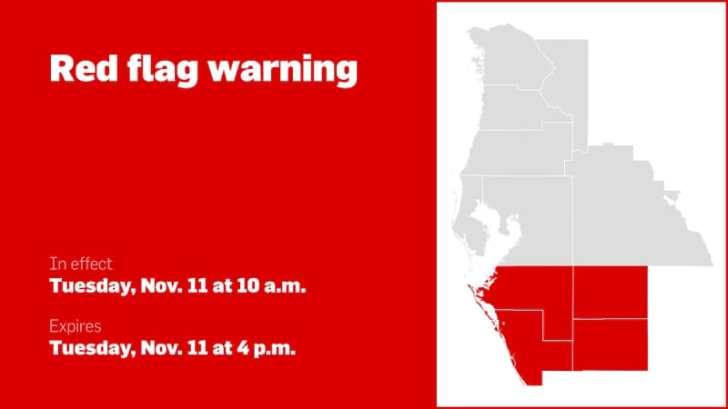 Национальная метеорологическая служба выпустила предупреждение с красным флагом в 3 часа ночи во вторник, действующее в период с 10 часов утра до 4 часов вечера. Предупреждение предназначено для округов Манате, Сарасота, Харди, Хайлендс, ДеСото, Шарлотта и Ли.