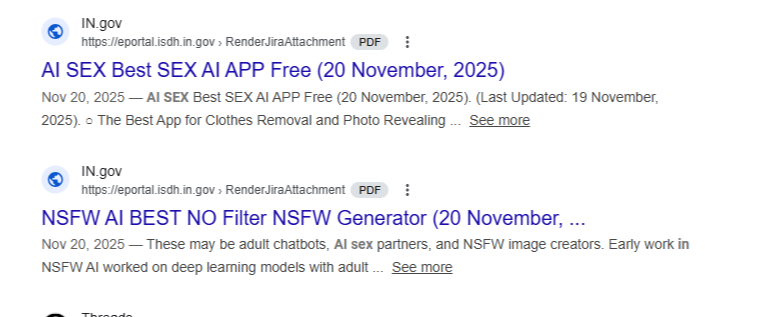 В ходе поиска Google, который состоялся 2 декабря, были проиндексированы PDF-документы по веб-адресу Департамента здравоохранения штата Индиана, рекламные приложения и инструменты, такие как «Best no filter NSFW generator» — аббревиатура от «not safe for work» — которые, например, могут генерировать изображения, которые искусственно снимают одежду человека.