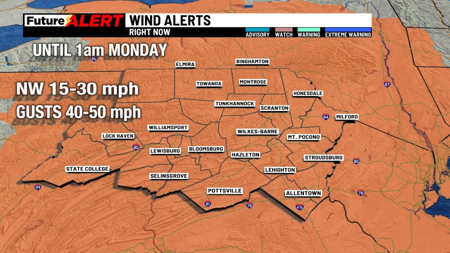 NWS выпустило рекомендации по ветру для нескольких округов в нашей зоне покрытия, перечисленных ниже по всему штату Кейстоун, которые будут длиться до 1:00 утра в понедельник.