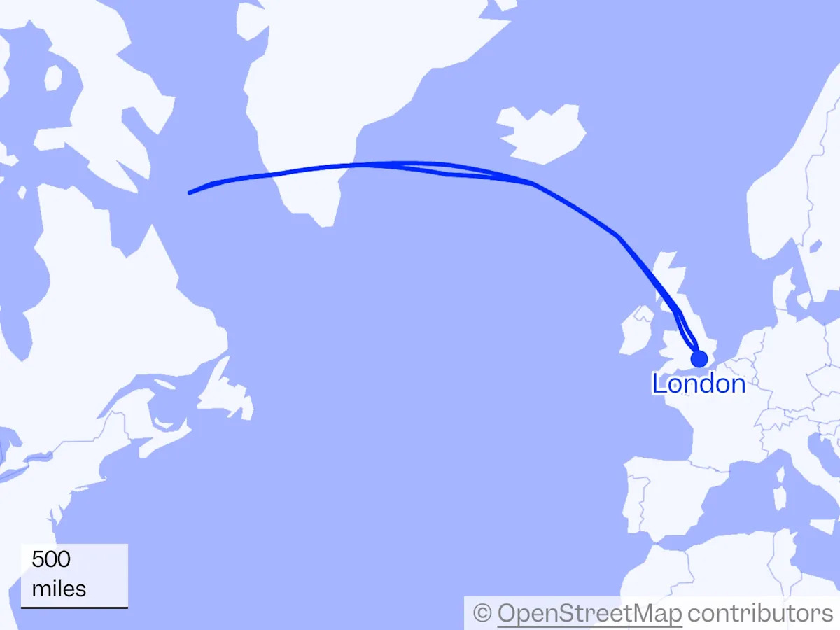 Он уже прошел Гренландию и находился всего в 150 милях от побережья территории Нунавута Канады, согласно данным Flightradar24.
