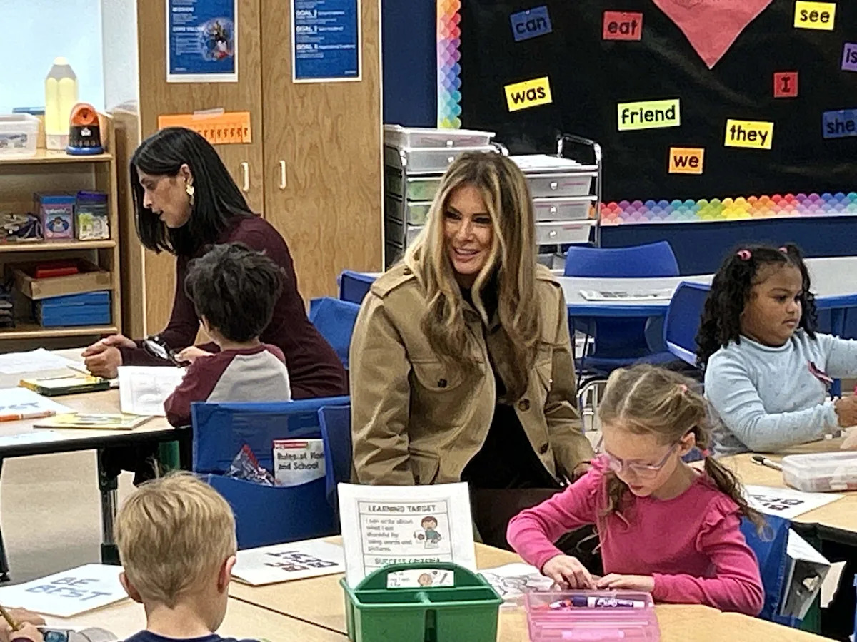 Незадолго до своего выступления в ангаре Трамп и Вэнс посетили пару базовых школ, начиная с класса продвинутого места в средней школе Лежен и заканчивая начальной школой Делалио в Нью-Ривер, где первая леди присела, чтобы помочь детсадовцу вырезать кусок строительной бумаги.