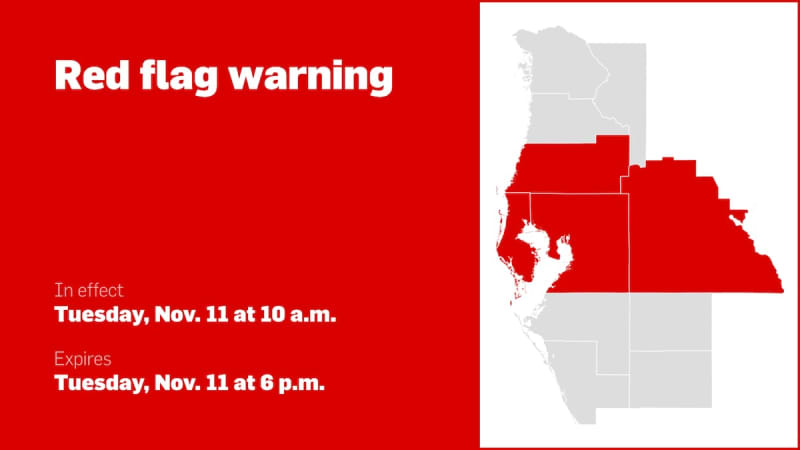 Предупреждение о красном флаге, выпущенное в Центральной Западной Флориде до вечера вторника, усилило пожарную опасность