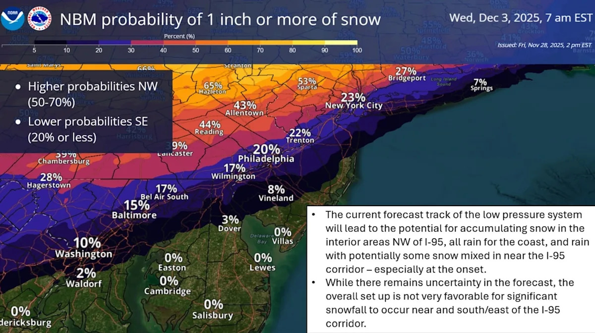 Последний прогноз Национальной метеорологической службы, опубликованный в пятницу днем, показывает самую высокую вероятность накопления снега в основном к северу и западу от коридора I-95.