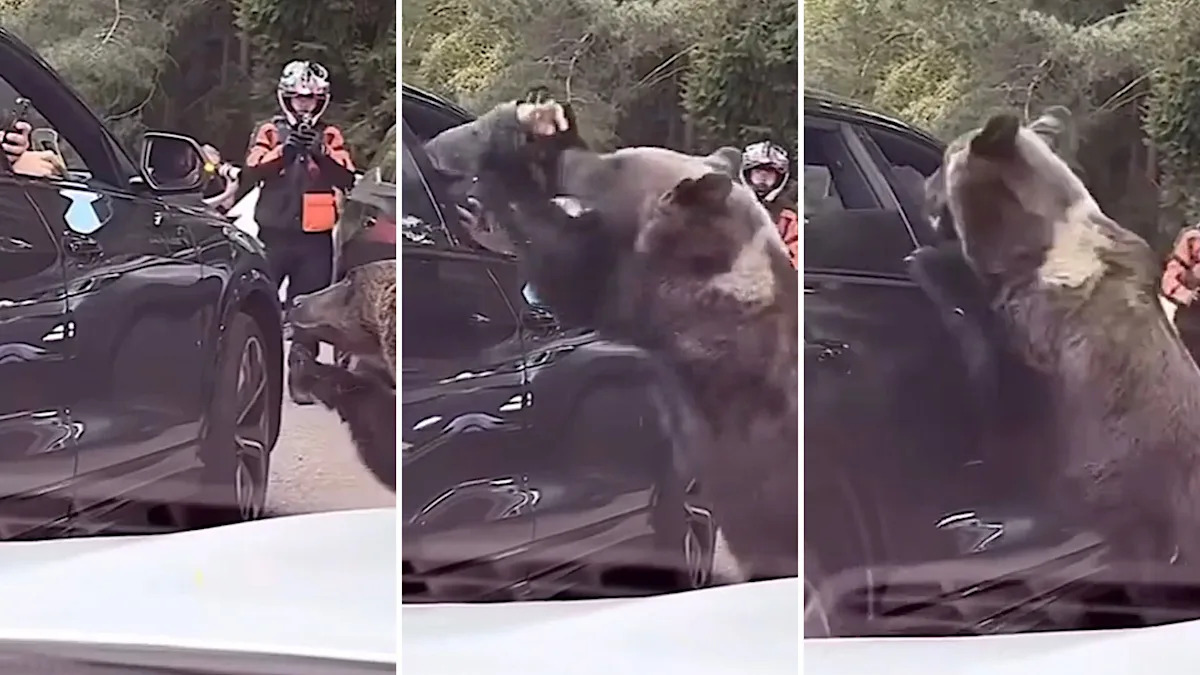 Медведь забирает еду у человека, а затем, по-видимому, пытается атаковать его руку, прежде чем отступить, когда человек отъезжает. Невозможно узнать, получил ли водитель какие-либо травмы, но им повезло, что медведь довольно быстро отступил.
